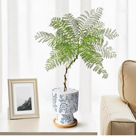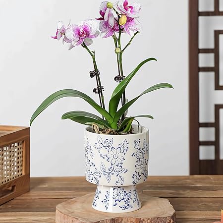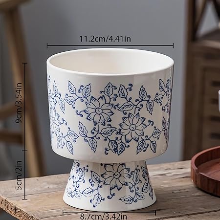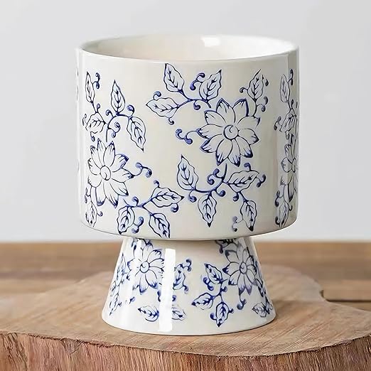 Elegant Blue and White Ceramic Planter with Pedestal – Hand-Painted Floral Motif Ideal for Desktop, Balcony, or Zen Room